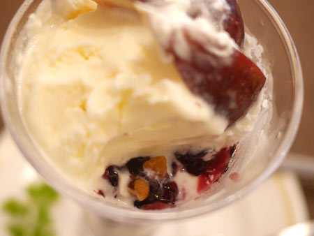 ヨーグルト、カシスアイス、バニラアイス、ぶどうゼリーの層になってます。