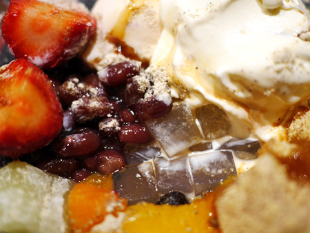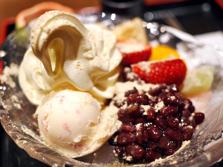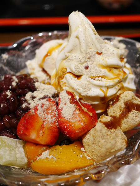 ソフトクリーム、苺、わらびもち、黄桃、あんず、求肥、