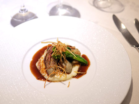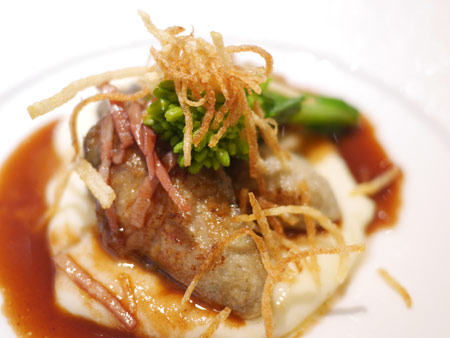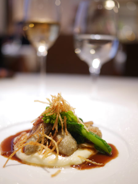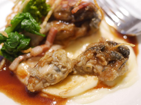 三陸産牡蠣のポワレとモッツァレラチーズ ベーコン風味の赤ワインソース