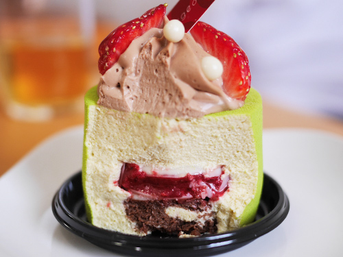 ミルクチョコレートのシャンティ、赤いフルーツのジュレの構成のケーキです。