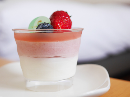 赤いフルーツのムース、ココナッツムース、桜風味のジュレの