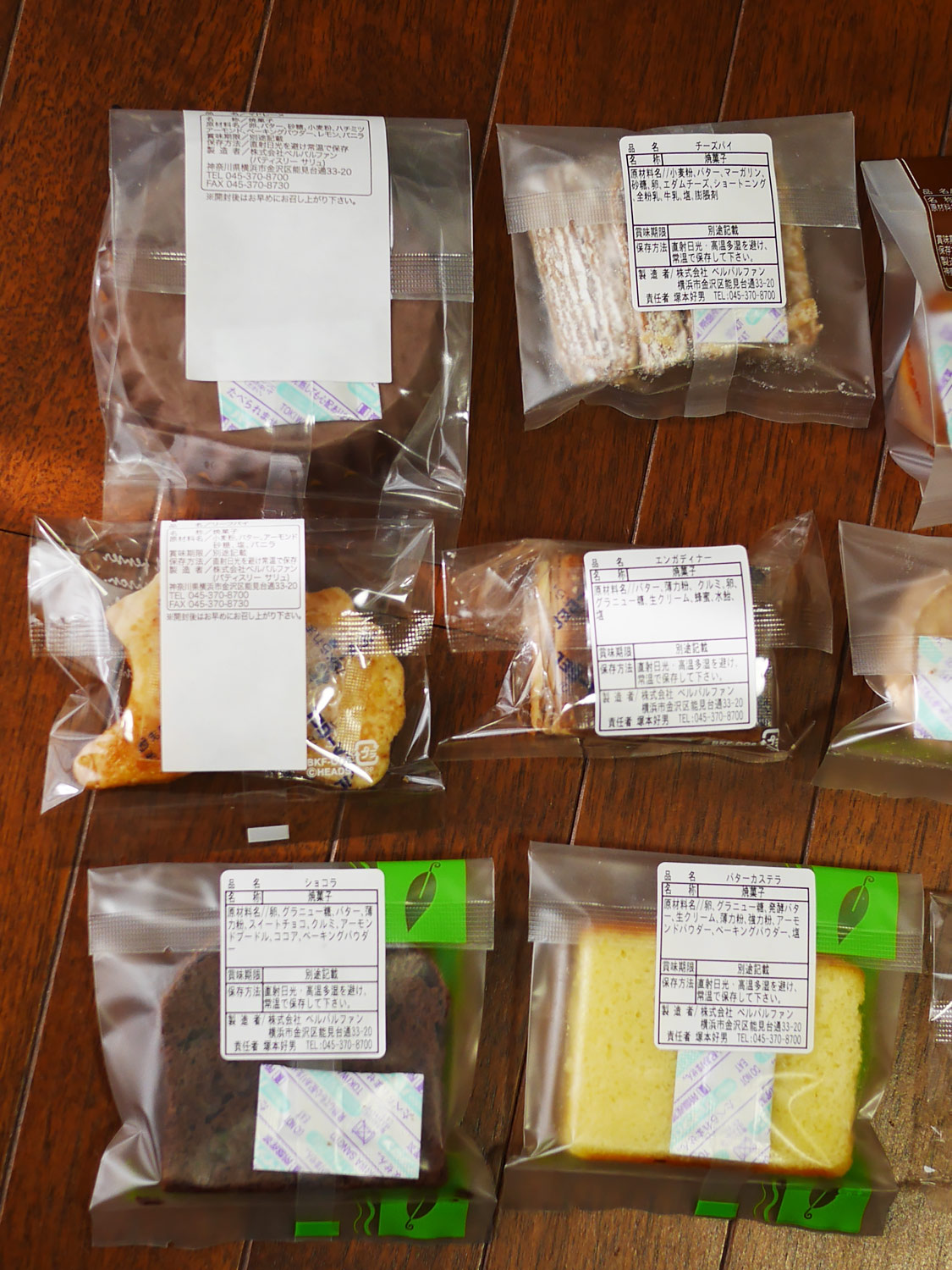 マドレーヌ、チーズパイ、みるくと栗、ネージュ2種、リーフパイ、エンガディナー、