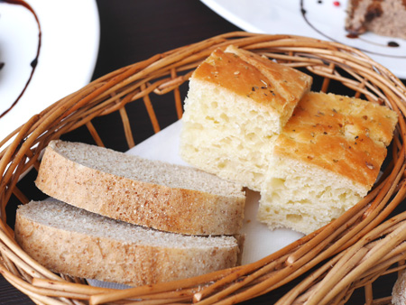 パンはフォカッチャと全粒粉のパン。