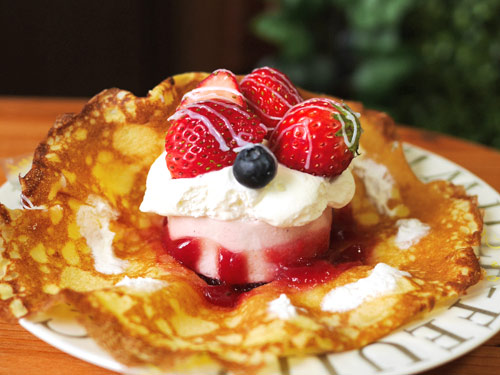 大きなクレープ生地に包まれた苺ムースケーキ。