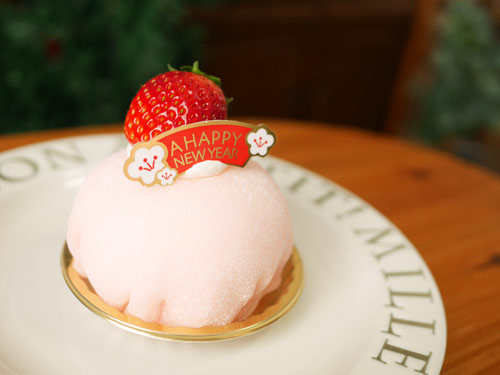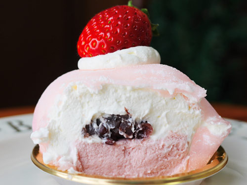 もちもちとろ~んな求肥の中にたっぷり生クリームと、小豆、甘酸っぱい苺ムースです♪