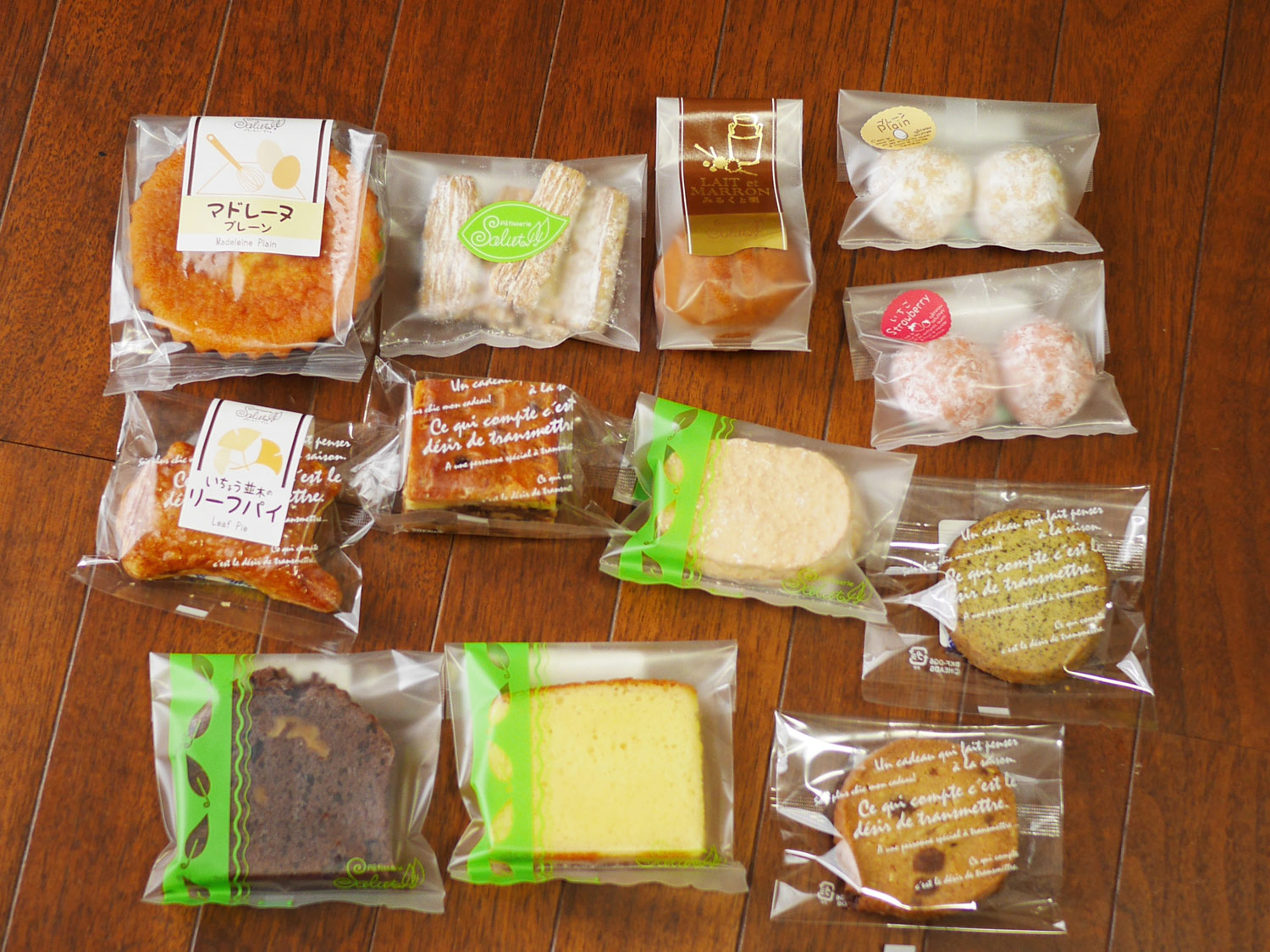 マドレーヌ、チーズパイ、みるくと栗、ネージュ2種、リーフパイ、エンガディナー、